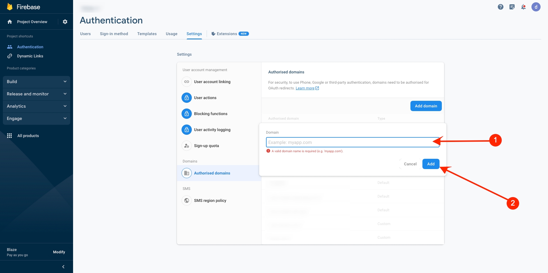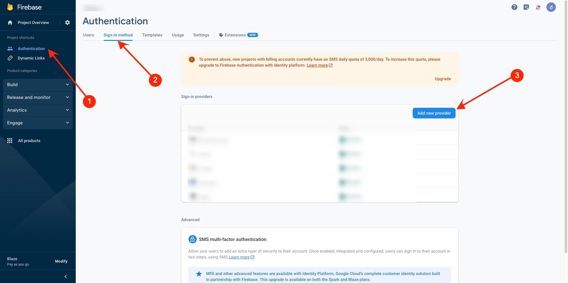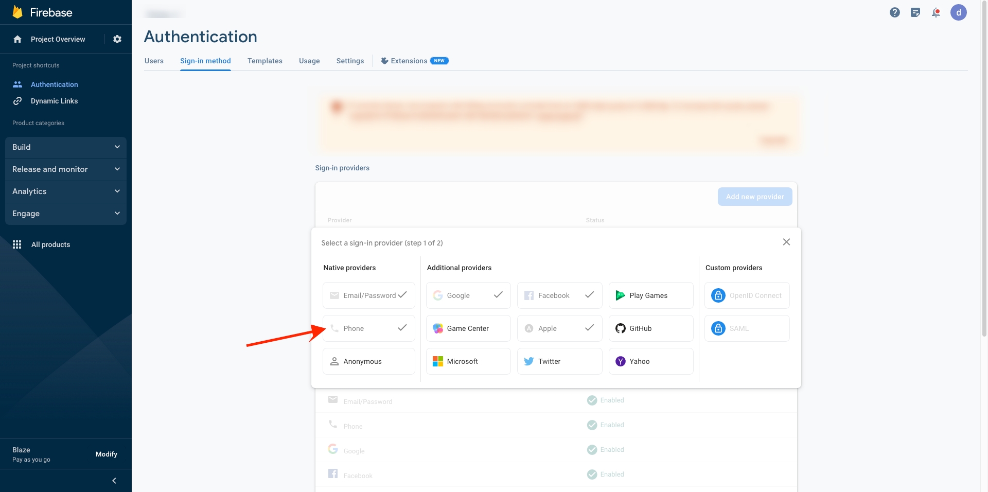 To be able to use OTP service in your apps, you need to first enable Phone auth service in your firebase project.