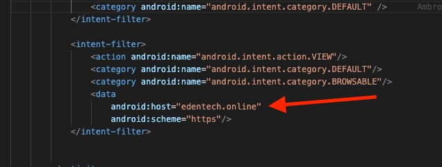 Find the line with "android:host" and check the value from "edentech.online" to your domain name, for example if your backend is https://backend.foodsale.com", set "foodsale.com"