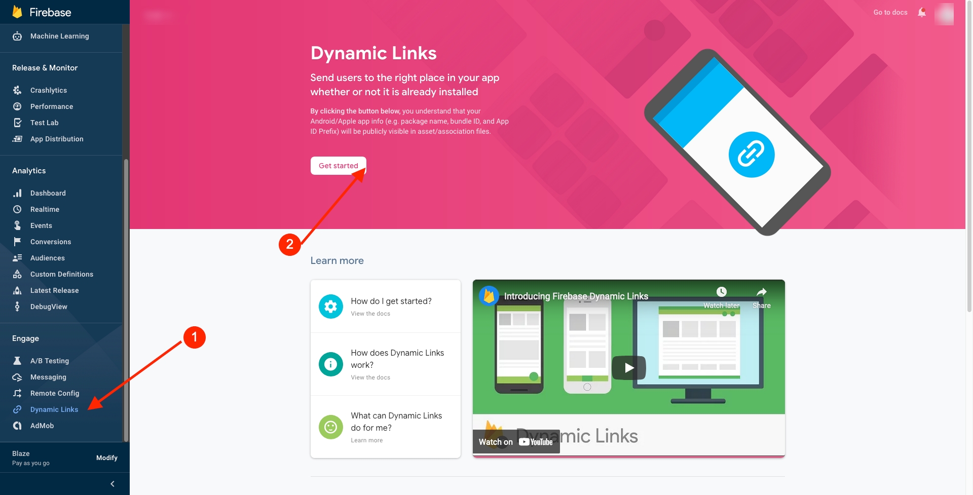 First before you can use this feature, you need to setup dynamic link on your firebase console. Visit your firebase console and select dynamic links in list of menu on the sidebar.