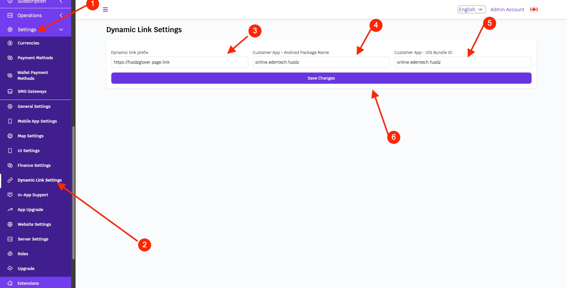 Then enter the link you created above in the dynamic link prefix input. You also need to enter the customer app package name(Android) and Bundle ID(iOS).