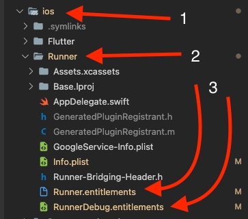For iOS you need to make changes to 2 files, Runner.entitlements and RunnerDebug.entitlements.