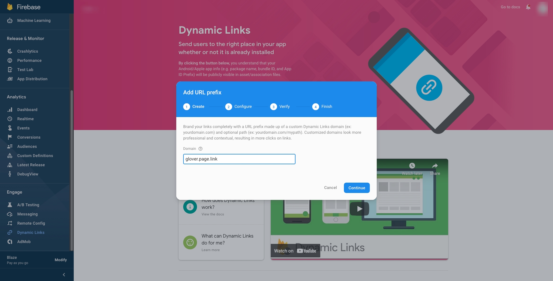 You can use a no-cost custom page.link subdomain. Enter a domain that matches your app name, for example we used: fuodzglover.page.link. You can use anything for yours.