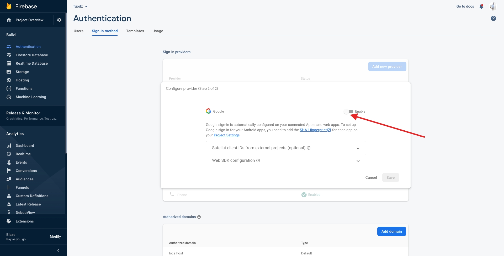 You need to enable Google sign-in on your firebase project. Login to your firebase console and select your project.