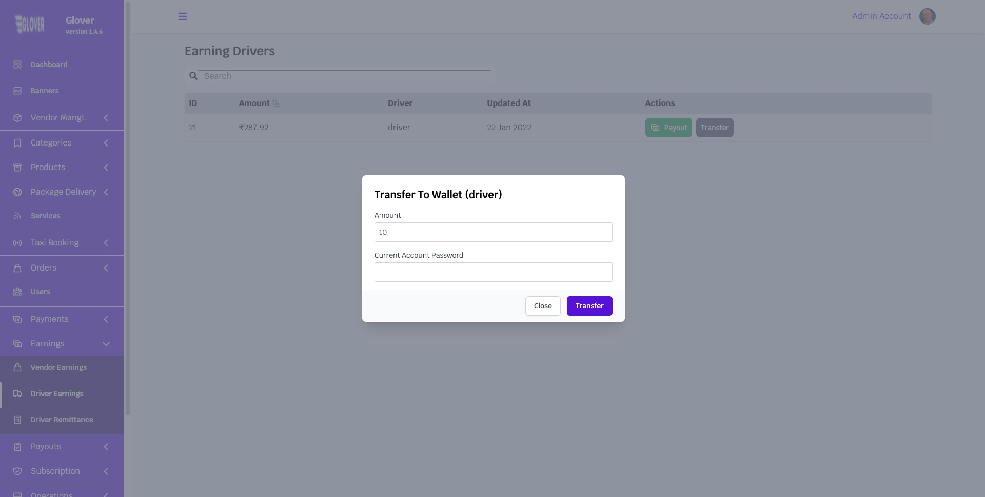 For transfer action button, this will allow the system to transfer entered amount from driver earning to driver wallet account. You will be requested to enter current admin account password to confirm transfer