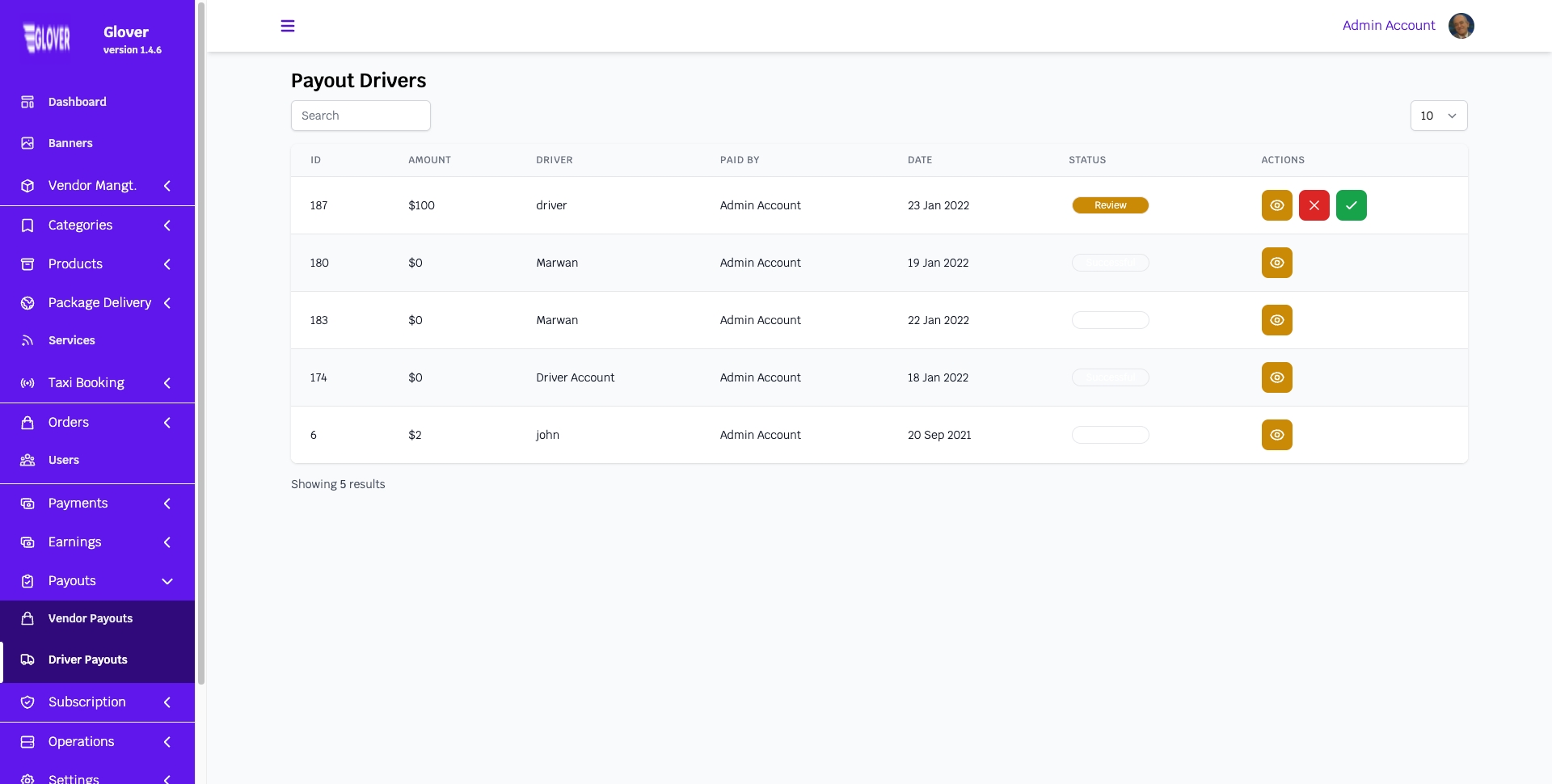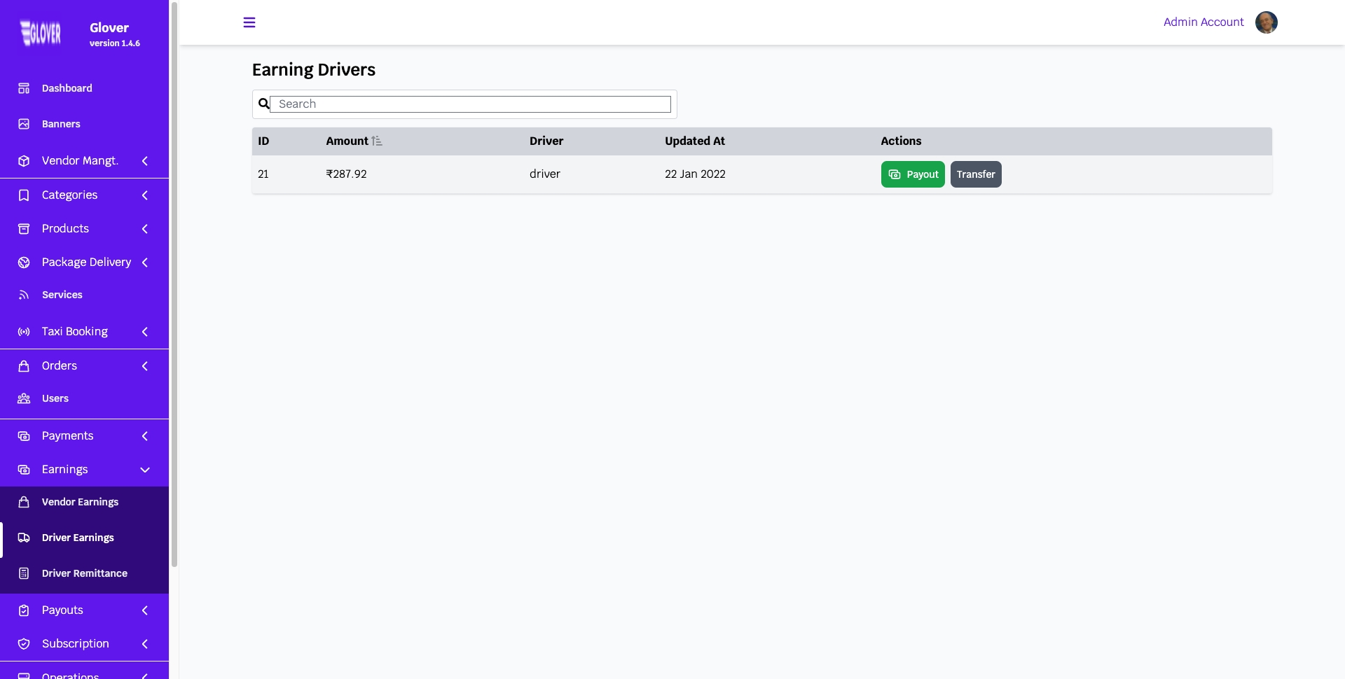 From the screenshot above, you can see list of drivers and their current earning with an action button to payout/transfer to driver wallet.
